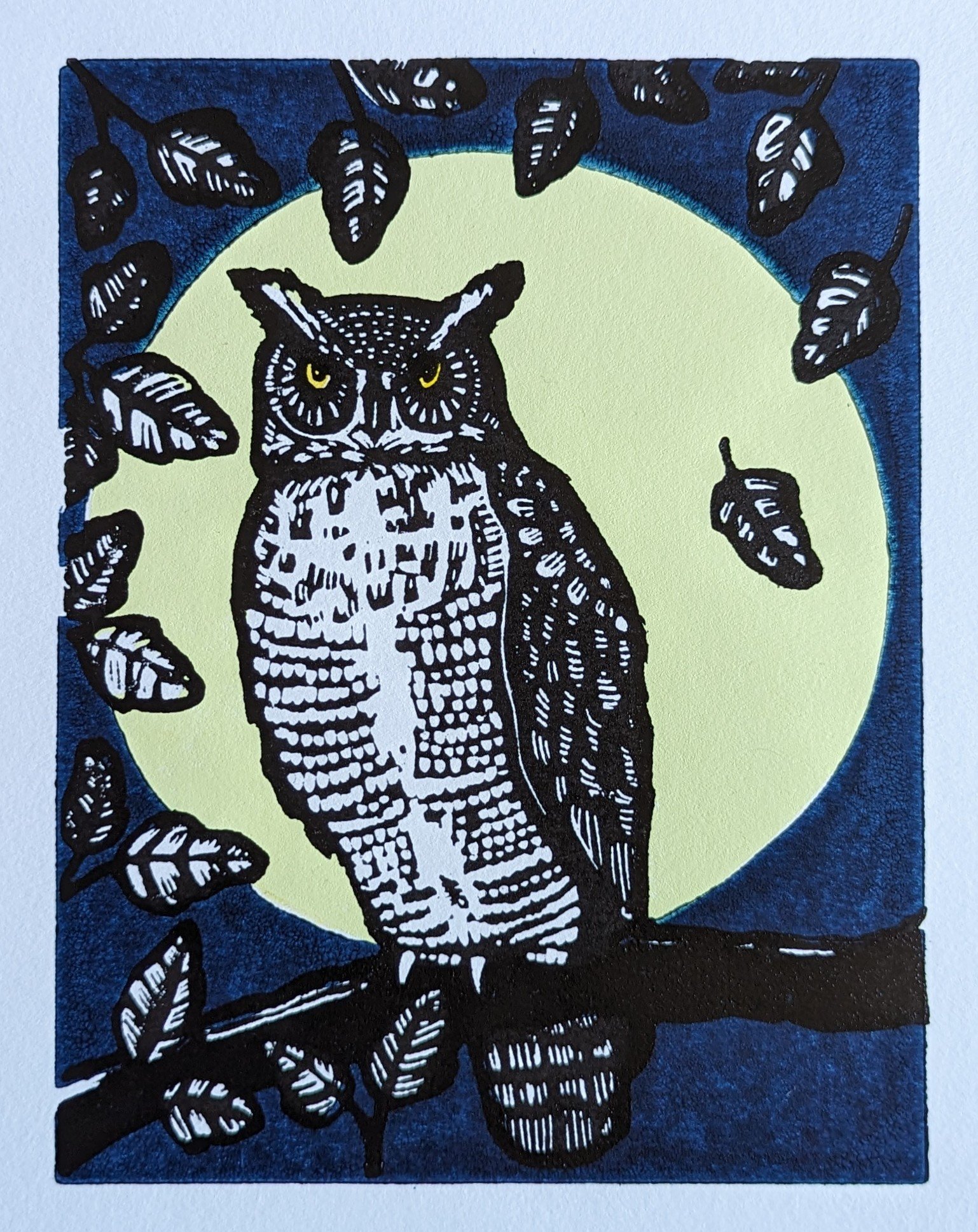 Join me for a small-group workshop where we will learn the basics of multi-block relief printmaking! This is an intermediate-level workshop for those that have already participated in a beginners relief printmaking class or that have successfully carved and printed linoleum block prints before. Multi-block printmaking uses more than one block to create a color layered print. Planning the layers and ensuring the alignment of the blocks is key to a successful print!
